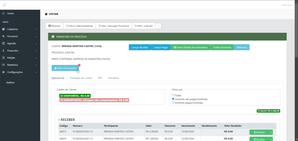 Fluxo de entrada e saída de caixa. Recebimento de processose pagamento de contas.